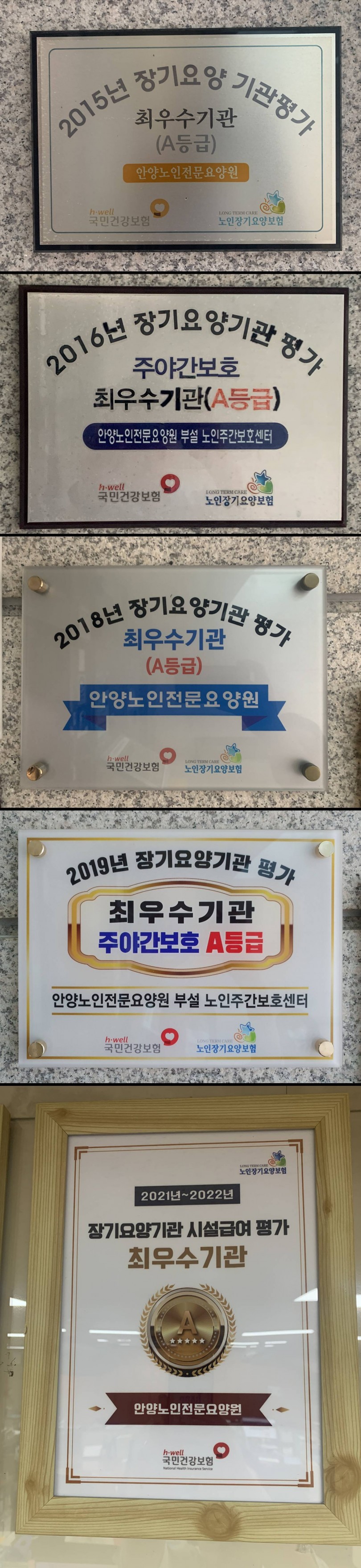안양노인전문요양원과 안양노인전문요양원 부설 노인주간보호센터는 평가가 시작된 이래로 현재까지 꾸준히 최우수기관(A등급) 으로 선정되어 오고 있습니다.