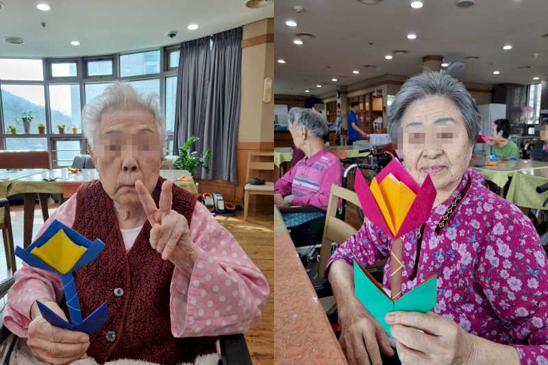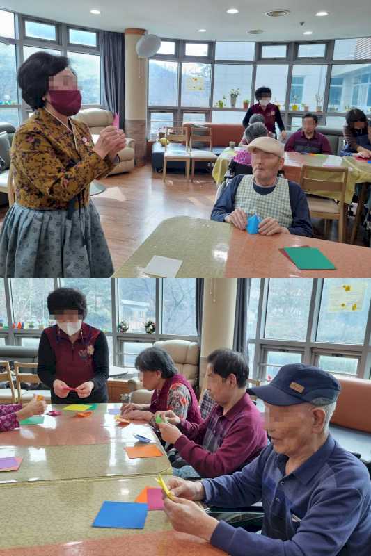 봉사자분들이 방문하여 어르신들께 재미있는 이야기와 이야기에 맞춤 종이접기를 알려주는 시간을 가졌습니다,