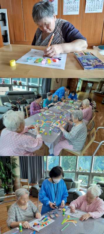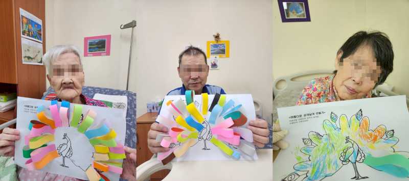 공작새를 꾸미기 위해 색종이로 깃털모양으로 만들어 꾸미시거나 이쁘게 색칠하시며 공작새를 다양한 방법으로 재미있게 꾸미셨습니다.