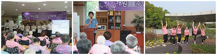 개원 11주년을 맞이했습니다. 어르신들과 직원들이 한 자리에 모여 감사예배를 드리고 서로 축하하는 시간을 가졌습니다. 작년에 이어 올해도 근속 10주년을 맞는 직원 5명에게 근속패도 수여되었습니다. 10년, 11년동안 함께한 어르신들과 직원들이 모여 기념촬영도 했습니다.