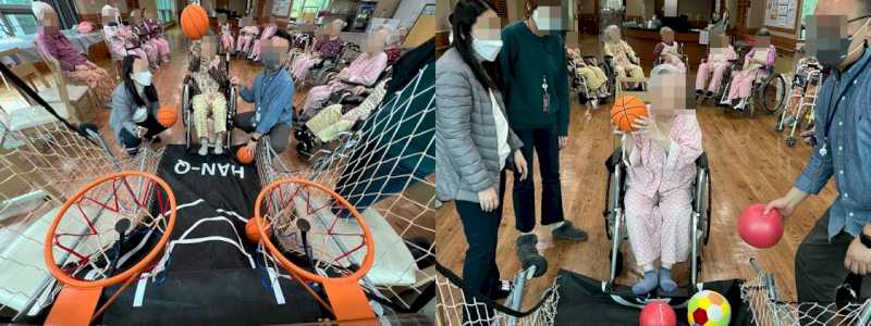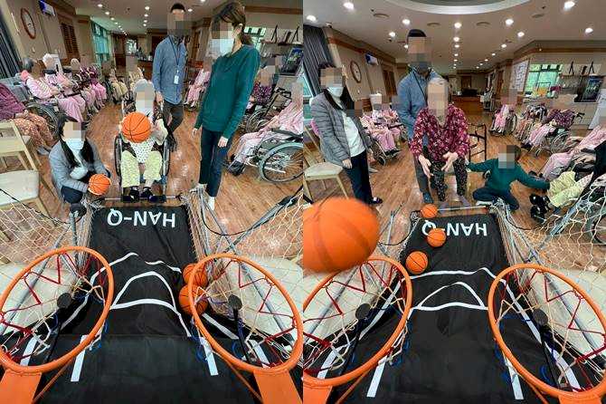 어르신들과 함께 실내에서 농구를 하는 시간을 가졌습니다.