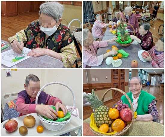 어르신들께서 과일 하나하나 감사의 마음을 담아 정성스럽고 깨끗하게 닦아 바구니에 예쁘게 올려주셨습니다. 완성된 과일 바구니를 배경으로 기념사진도 찍으시면서 활동을 마무리 하였습니다.