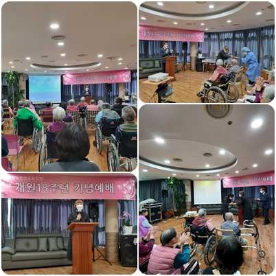 개원 18주년을 맞이해서 코로나 이후에 처음으로 1,2,3층 어르신들이 거리두기를 한 채로 한자리에 모여서 기념예배를 함게 드렸습니다.