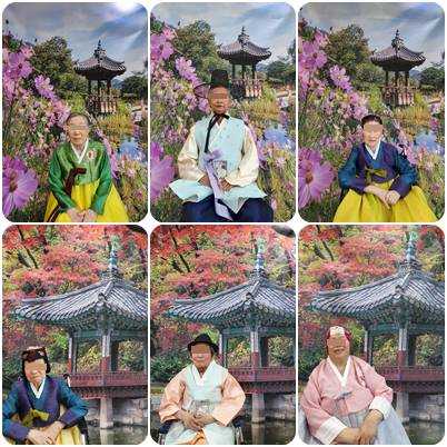 가을분위기 나는 배경에서 한복을 입고 사진을 찍으면서 간접적으로 나들이 가는 기분을 내고, 한복을 입으면서 추석명절을 간접적으로 경험하는 시간을 가졌습니다.