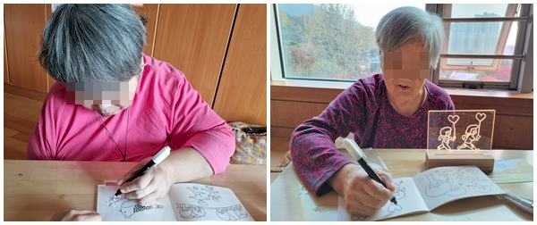 뇌를 일깨우는 순간, 오감자극활동 프로그램으로 무드등 만들기 활동을 하였습니다. 도안을 따라 그리는 작업을 어려워 하셨지만 끝까지 완성시켜주셨습니다.