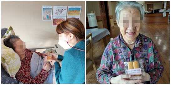 11월 11일 빼빼로데이를 맞아 어르신들께 빼빼로 모양과 닮은 길쭉한 빵을 선물로 드렸습니다.