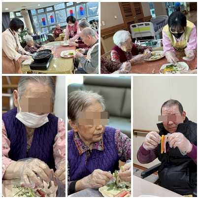 설날을 앞두고 꼬지전 만들어 즉석에서 드시는 시간을 마련했습니다. 모두 솜씨가 좋으셔서 후딱후딱 금방 만드시고, 직접 만드신 꼬지전과 미리 준비된 만두를 맛보셨습니다. 다행히 어르신들께서, 입맛에 맞다고, 맛있다하셨습니다.