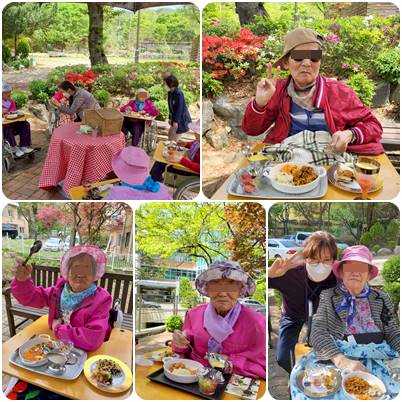 요양원 내 벤치에서 식사를 하시면서 소풍 나온것 같다면서 즐거워 하시고 기분좋은 시간을 가졌습니다.
