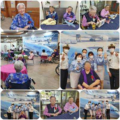 어버이날을 맞이해서 코로나로 여행가지 못하는 아쉬움을 비행기에 탑승하듯이 직원들이 승무원복을 입고 기내식처럼 식사도 하면서