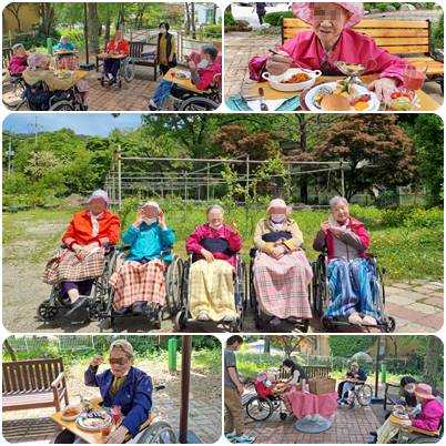 코로나로 인해 외부로 나가지 못하지만 요양원 근교에 드라이브를 한 후에 돌아와서 요양원 앞 정자에서 소풍 나온 것 처럼 음식을 드시고 소풍나온 것 같은 기분을 내었습니다.
