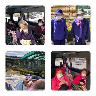 2020년 10월 7일 침상생활하시는 어르신들 모시고 침상 채 옥상정원에서 시간을 가졌습니다. 또한 거동이 가능한 어르신을 모시고 요양원 산책을 하였습니다.