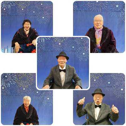 어르신들이 옷을 챙겨 입고 사진을 찍고 여자 어르신은 가발을 써보고, 남자어르신은 중절모를 쓰고 설빔입는 기분을 내었습니다.