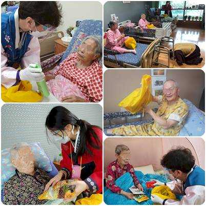 오전에는 어르신에게 선물나누기를 하였습니다. 어르신이 기분좋아하셨습니다.