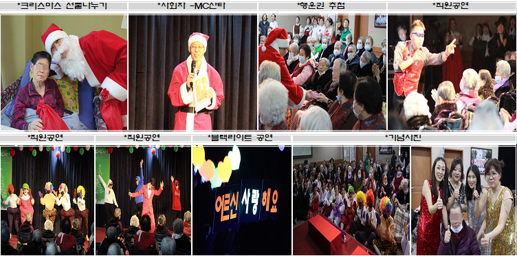오전에는 어르신들에게 인사도 드리고 선물을 나누는 시간을 가졌습니다. 오후에는 본 행사인 ‘MC 산타와 친구들’이 진행되었습니다. MC 산타의 유쾌한 인사를 시작으로 어르신들의 흥을 돋우기 위한 행운권 추첨이 있었습니다. 그 후에는 직원들이 어르신을 위해 흥겹고 즐거운 무대를 선보였답니다. 조금은 어설픈 공연이었음에도 불구하고 어르신들께서 즐거워해주시고 큰 박수와 호응을 보내주셨답니다. 그리고 사무실 직원들이 함께 준비한 블랙라이트 공연을 끝으로 행사를 마쳤습니다.