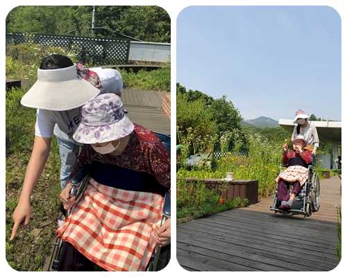행복한 마실로 어르신들과 함께 요양원 옥상정원 산책을 하였습니다.