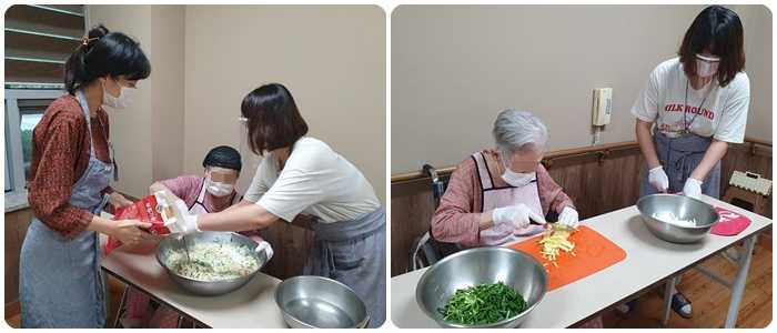 오 감각자극 활동으로 어르신들과 함께 요양원 텃밭에서 수확한 부추를 사용하여 부추전을 만들었습니다.