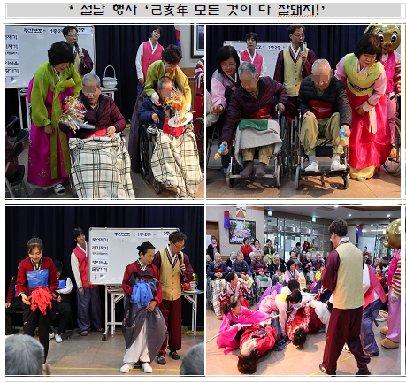 2019년 2월 1일 설날행사‘己亥年 모든 것이 다 잘돼지!’로 어르신들과 직원들이 함께 팀을 이루어 전통놀이대항전(풍선제기, 제기차기, 팽이오래돌리기, 줄다리기)을 하였습니다.