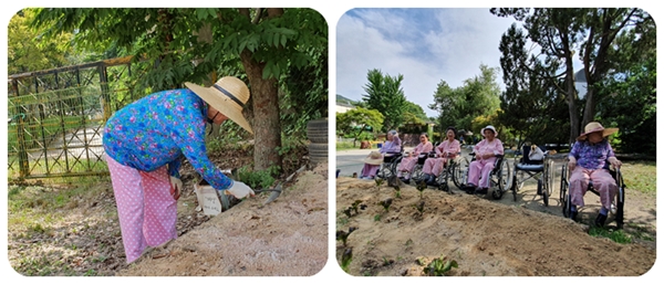 어르신들과 직원들이 힘을 합쳐 잡초를 뽑고 상추와 호박을 심었답니다.