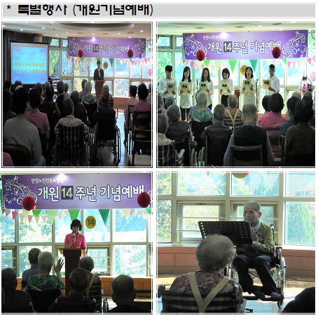 10월 19일 (금) 개원 14주년을 기념하여 어르신과 직원이 모여 함께 예배를 드리고 축하하는 시간을 가졌습니다. 이신영부장이 예배인도를 맡아주셨고, 직원들의 특송, 감사기도, 법인 상임이사님의 축사, 요양원 어르신의 축사 순으로 진행되었습니다. 그리고 근속직원 2명에 대한 근속패를 수여하는 뜻 깊은 시간으로 마무리하였습니다