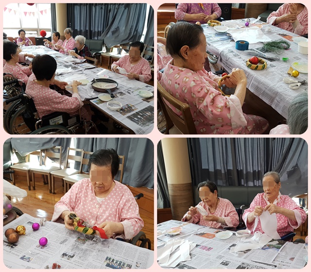 어르신들께서 한지와 장식품(리본, 볼 등)을 이용하여 예쁜 리스를 만들어 주셨습니다,