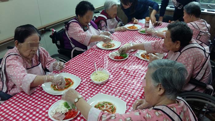 요리활동으로 사회복지실습생과 함께 어르신들이 직접 피자를 만들어보는 시간을 가졌습니다.