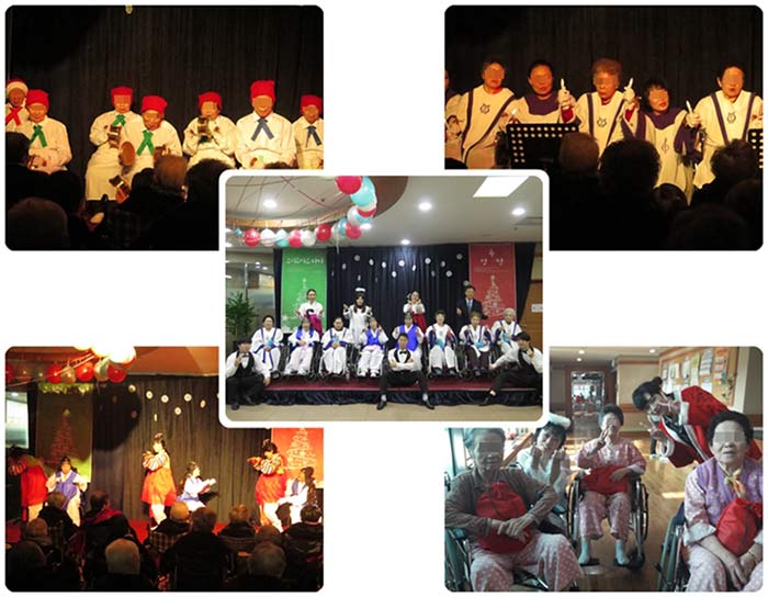 오전에는 어르신들께 선물을 전달하는 시간을 가졌고, 오후에는 각 층의 어르신과 요양보호사 자매님들이 준비한 ‘고요한밤 거룩한밤’ 합창과 꼭두각시 공연, 사회복무요원들의 차력쇼 그리고 직원들의 멋진 춤과 민요공연을 관람하셨습니다. 이어서 어르신들을 위해 준비한 맛있는 뷔페로 저녁식사를 하시면서 즐거운 하루를 보내셨습니다.