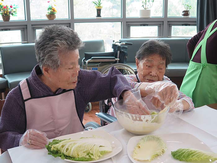 요양원 야외 텃밭에서 수확한 배추로 어르신과 함께 배추전을 만들었습니다.^^