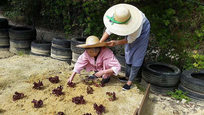 어르신들과 함께 심어놓은 배추와 상추가 아주 잘 자라고 있었습니다.