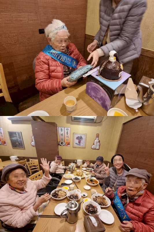 생신이신 어르신과 같이 생활하시는 어르신들을 모시고 맛있는 식사를 하시며 생신을 축복하는 시간을 가졌습니다.