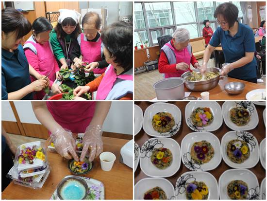 봄을 맞이하여 요리활동으로 어르신과 함께 꽃 비빔밥을 만들어보았습니다.